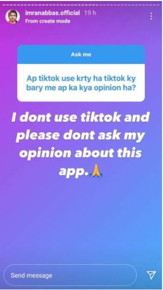 The question initially arose after a fan hopped on to Imran’s Instagram Stories Q&A and asked, “Ap tiktok use krty ha tiktok ky bary me ap ka kya opinion ha? (Do you use TikTok? What is your opinion on it).”