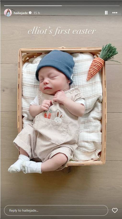On Easter Sunday, April 21, Eminem’s daughter took to her official Instagram Story to share an adorable photograph of her newborn son, Elliot Marshall McClintock, as she celebrated her first festival with the little boy.