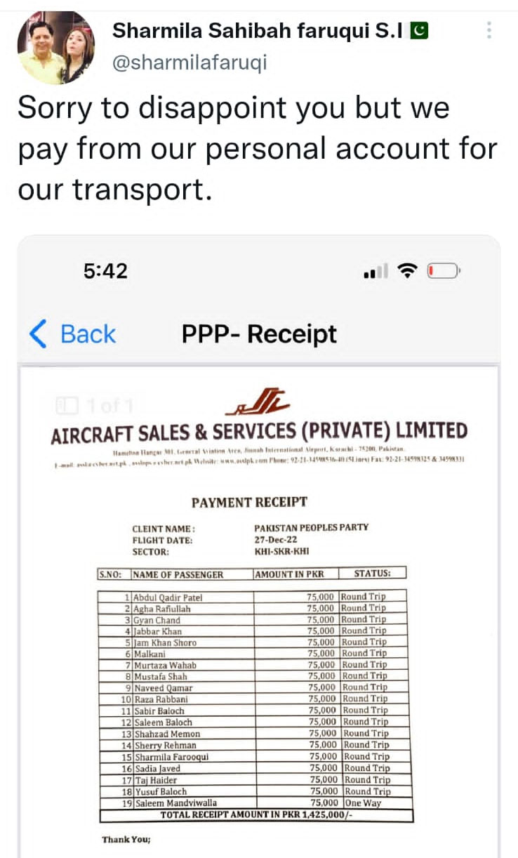 شرمیلا فاروقی نے دعویٰ کیا ہے کہ اخراجات ارکان اسمبلی نے اپنی جیب سے ادا کیے، چارٹر کمپنی کو کراچی تا سکھر اور پھر واپس کراچی آنے کے لئے 14 لاکھ 25 ہزار روپے کرایہ دیا گیا۔