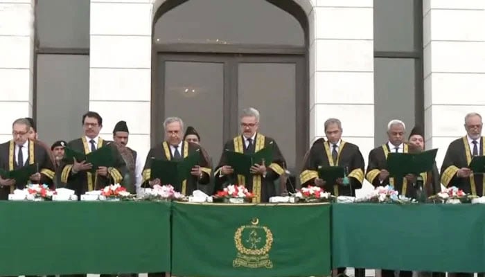 اسلام آباد،کراچی(نمائندگان جنگ)سپریم کورٹ کے 7ججوں، ہائیکورٹس کے قائم مقام چیف جسٹسز نے حلف لے لیا،حلف لینے والوں میں جسٹس عامر فاروق، اشتیاق ابراہیم، شکیل احمد، شفیع صدیقی، صلاح الدین پنہوار ،جسٹس ہاشم کاکڑ شامل، صدر مملکت آصف زرداری نے ایون صدر میں اسلام آباد ہائیکورٹ کے قائم مقام چیف جسٹس سردار سرفراز ڈو گر سےحلف لیا،حال ہی میں سپریم کورٹ کا حصہ بننے والے چھ مستقل اور ایک قائم مقام جج نے اپنے عہدوں کا حلف اٹھا لیا،ان سے، حلف چیف جسٹس یحیٰ آفریدی نے لیا ، ا س ضمن میں جمعہ کے روز منعقدہ تقریب میں حلف لینے والوں میں جسٹس عامر فاروق، جسٹس اشتیاق ابراہیم، جسٹس شکیل احمد، جسٹس شفیع صدیقی، جسٹس صلاح الدین پنہوار اور جسٹس ہاشم کاکڑ شامل تھے ، جسٹس میاں گل حسن اورنگزیب نے سپریم کورٹ کے قائم مقام جج کے عہدہ کا حلف اٹھایا ،تقریب میں سپریم کورٹ اور ہائیکورٹ کے ججوں، اٹارنی جنرل، ججوں کے اہلخانہ، پاکستان بار کونسل اور سپریم کورٹ بار کے عہدیداران،صحافیوں اور عدالتی عملہ نے شرکت کی، اس موقع پر شریک ہونیوالے سپریم کورٹ کے ججوں میں جسٹس سید منصور علی شاہ، جسٹس منیب اختر،جسٹس عائشہ اے ملک، جسٹس اطہر من اللہ اور دیگر جج شامل تھے جبکہ اسلام آباد ہائیکورٹ کے جسٹس محسن اختر کیانی نے بھی شرکت کی۔دریں اثناءاسلام آباد ہائیکورٹ، پشاور ہائیکورٹ اور سندھ ہائیکورٹ کے قائم مقام چیف جسٹسزنےبھی حلف اٹھالیاہے،اسلام آباد ہائیکورٹ کے قائم مقام چیف جسٹس سردار سرفراز ڈوگر نے ایوان صدر میں منعقدہ تقریب میں اپنے عہدے کا حلف اٹھا لیا۔