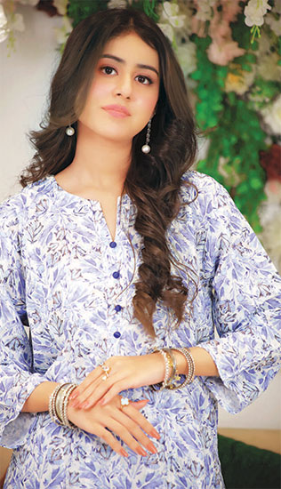 ذرا ملاحظہ فرمائیے،’’میچنگ سیپریٹس‘‘ اسٹائل میں ڈارک پِیچ رنگ پھول دار پرنٹ سے مزیّن ٹراؤزر شرٹ ہے، تو سفید بیس پر نیلے رنگ کی پھول پتیوں کا پرنٹ بھی بہت حسین سا تاثر دے رہا ہے۔ ایک اور انداز میں نارنجی سے رنگ پر رنگا رنگ گل بوٹوں کا پرنٹ ہے، تو گہرے کاسنی سے رنگ میں گتھواں سے پرنٹ کا بھی جواب نہیں۔ ہلکے آسمانی رنگ زمین پر نارنجی، سُرمئی کلیوں، پھولوں کا غلبہ ہے، تو آف وائٹ بیس پر خوب رنگ برنگ باغیچے کا سا منظر تو جیسے سارے ہی پرنٹس، رنگ و انداز پر حاوی معلوم ہو رہاہے۔