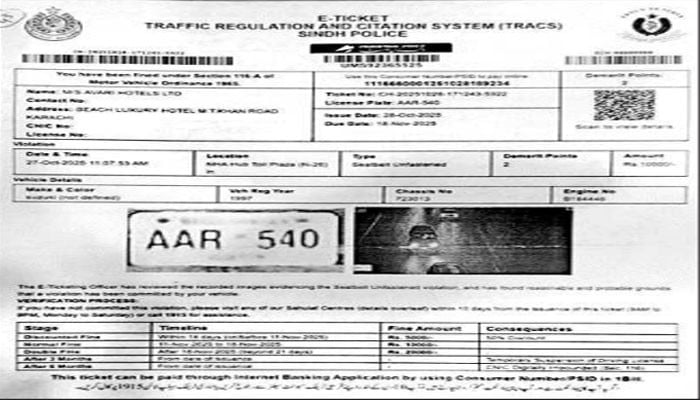 سیٹ بیلٹ نہ پہننے پر کوئٹہ کی گاڑی کا 10 ہزار کا ای چالان کراچی کے کار مالک کو بھیج دیا گیا۔ ایک ہی نمبر پلیٹ ہونے کی وجہ سے اس کا ای چالان کراچی کے مالک کو آیا۔