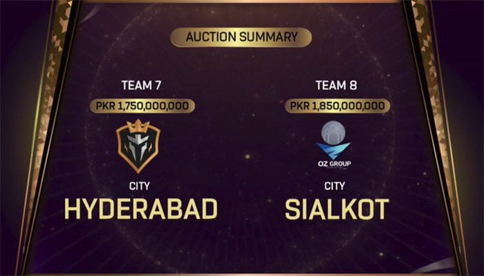 خیال رہے کہ پاکستان سپرلیگ (پی ایس ایل) کی ساتویں ٹیم ایف کے ایس نے 175 کروڑ اور آٹھویں ٹیم او زی ڈویلپرز نے 185 کروڑ روپے میں خرید لی گئی۔ ٹیموں کے نام بالترتیب حیدرآباد اور سیالکوٹ ہوں گے۔