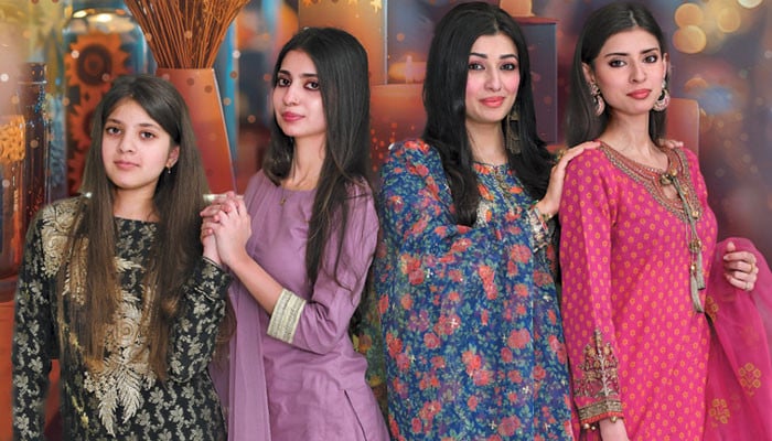 پھرسیاہ رنگ میکسی پر سلور دھاگے، تلّے اور ستارے کا انتہائی باریک، گتھواں ساکام بھی خُوب غضب ڈھا رہاہے۔ رات کی کسی تقریب کے لیے اِس سے بہتر انتخاب ممکن نہیں۔ اسی طرح آئس بلیورنگ کے تھری پیس سوٹ کی کام دار قمیص کلاسیک لُک دے رہی ہے، تو ساتھ اسٹریٹ ٹرائوزر اور لائٹ شیفون دوپٹےکا امتزاج بھی کمال ہے۔ فیروزی رنگ جدید طرزفرنٹ اوپن میکسی پر جال نُما کڑھت ہے، جس میں باریک ستارے اور ریشم کا کام بھی شامل ہے اور یہ ایک نسبتاً آرام دہ مگر اسٹائلش جوڑا ہے، جو فیملی گیٹ ٹو گیدر، موسمِ بہار یا گرما کی شاموں کے لیے انتہائی فرحت بخش ثابت ہوگا۔