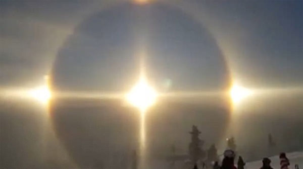 رپورٹ کے مطابق سائنسدانوں کا اس حوالے سے کہنا تھا کہ آسمان پر بیک وقت تین سورج کا دکھائی دیناعرفِ عام میںسن ھالو 'کہا جاتا ہے جو موسمِ سرما میں بائیس ڈگری کے زاویئے پر برف کے کرسٹل سے گزرنے والی روشنی ہے جو سورج کے گرد بننے والے روشنی کا گول دائرہ یا ہالے نمودار کردیا ہے جسکی وجہ سے آسمان پر ایک کے بجائے تین سورج دکھائی دیتے ہیں۔