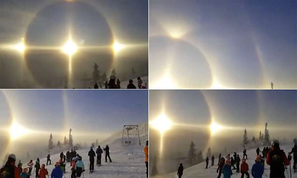 سویڈن کے ریزورٹ میں برف پوش پہاڑوں کے اوپر قدرت کا خوبصور منظر اُس وقت دیکھا گیا جب آسمان پر ایک نہیں بلکہ تین سورج ایک ساتھ روشنی پھیلا رہے تھے اور اس حیرت انگیز منظرکو دیکھ کر ہر کوئی دنگ رہ گیا اور لوگ یہ مناظر اپنے کیمرے میں قید کرنے لگے۔