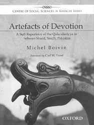 Competing with the glut of books in the market on the Taliban in Pakistan is the rush of new scholarship on Sufism, its intellectual and spiritual antithesis. Major publishing houses have now taken to promoting messy field diaries and primary listing of data made by European scholars as erudite commentary on the mystical path, the popular and purportedly ‘softer’ face of Islam. This project of knowledge is invariably Orientalist and tied to the technologies of power, often incapable of appreciating oral traditions and parallel discourse. A new addition to this literature is the carefully worded and well illustrated pictorial, Artefacts of Devotion, a Sufi repertoire of the Qalandariyya in Sehwan Sharif, Sindh, Pakistan by French academic Michel Boivin who examines the art objects produced by local artisans at one of the most popular shrines in the subcontinent, the shrine of Usman Merwandi or Lal Shabaz Qalander in Sehwan, Sindh. Some of these objects