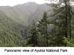 to mixed coniferous forest, including towering trees of blue pine and silver