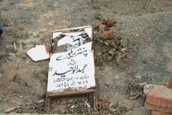 “The police were unaware of the incident till late Monday night and lodged a case against some unknown persons after keeping the community lawyers waiting for many hours,” says a community representative. Hitting the Ahmadi worship places and forcing them to remove Islamic verses and names, which they are forbidden to use according to Section 298 A, B, and C of Pakistan Penal Code, has become a tool to harass and persecute them. According to investigations into some of the cases of vandalism in different parts of the country, such acts of harassment and persecution are systematically done by organised groups of clerics and locals having connections with anti-Ahmadi extremists groups. In July, 2012, a local cleric Tufail Raza, claiming his association with the Khatme Nabuwwat Lawyers Forum, reportedly, approached Liaquatabad police station seeking the removal of Islamic inscriptions from tombstones at this particular Ahmadi graveyard which was established in 1980. “The police did not follow up on the application,” says Shahid Ataullah, a local representative of the community. “Later, another group of these mischievous elements moved the local court and in October, the Additional District and Sessions Judge Lahore had disposed of this case, asking the police to follow the law.” So what happens that the job of the state is taken up by some members of society and they don’t even get punished? “A police case was