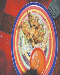 outside eating area is decorated with The waiters, an assortment of men and women, wear black and smile, but overall the place gives off a dingy, somber mood punctuated by the menu card which sports a Mayan design on its cover and is another example of solemnity with its black lettering on dark red. The menu is a healthy assortment of starters, steaks, chicken and fish dishes, finished off with desserts and drinks. The beauty of a restaurateur, however, is in the playing and Cheema plays it well. While the mood setting is dim by design, the food is not. For starters try the colorful, wonderful Adobe house salad, an inspired mix of baby lettuce, peppers, sunflower seeds and feta cheese which made all the difference, or a plate of chilli peppers, which are jumbo-sized and filled with gooey cheese. The main course is a