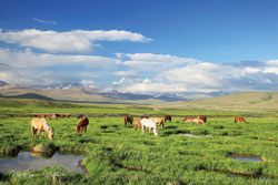 horses grazing on the wide expanse of Deosai under a blue sky richly