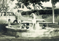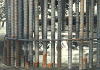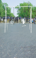 just remembered by the owners of shops, cars and motorbikes who It appears that Farida is doing the same in her art, by connecting to a larger audience and exploring common concerns. She has constructed her Lenticular prints -- a technique she employs quite imaginatively -- with images of various parts of Lahore, and interjected these with other visuals in order to complete a picture that denoted her content. For example in 'Qadam Qadam Azad' the photographs of children playing with water from a fountain were blended with the armatures of pillars in steel -- structures usually erected for large-scale constructions. Due to the inherent quality of Lenticular, the scene of a kid's play turned into a state of siege (ironically suggested in the title of the work). A similar scenario was depicted in 'Thandi Sarak' (informal name for the Mall Road in the past) with a girl and boy on swings inside a barricaded space. Queues of policemen, with helmets on and batons in hand, formed a border around the two. This particular image referred to a constant conflict between the security personnel and protestors, witnessed by many in the recent past. Another Lenticular print