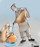 he wanted to And the mind might still have been at it because I noticed something. It must be after years, if not decades, but the other day I actually saw a man using a mashk. That is our word for a goatskin. The skin of a goat is taken off intact, cured and stitched back in the original shape with the four legs tied together to form a handle by which it is slung across one shoulder, and believe it or not till my youth it was the normal container for transporting water! The diminutive of it was mashkeezah which I suppose would be a lambskin, and the man in the neighbourhood who wielded it was called a mashki, or, if you were really educated and polite he was the bahishtee which means man of heaven because it has always been held that quenching a thirst is an act of great piety and sure to take you to heaven. It is something which must have been used for thousands of years unchanged until the end of the twentieth century, and I am not even sure if the methods of curing the leather changed at all during all this time. The ones I remember from my childhood certainly looked as if the way of curing was the same at least from the time of Moses, or earlier, if I am to believe what Hollywood shows in its Biblical epics. Of course until Medieval times, a small goatskin was the usual container for wine in Europe; but it is amazing to think that a goatskin was used here until the twentieth century. But I remember the scene well. The goatskin, of which the neck was left open as the inlet, was filled at one of the 'Municipal Committee' taps at the troughs made for the horses, and then he brought it, dripping a bit, to the house to fill the buckets and containers. Or simply shower it all over the dust in the backyard. Nowadays, in most prosperous neighborhoods, water comes from the taps and the local tube-well. Sometimes in the hot weather the water runs a bit low, and with our usual ingeniousness we have found the remedy. The thing is to set up a small electric water pump -- called a 'donkey' pump for some reason -- in the house, connect it to the main water pipe for the neighbourhood running in the street outside the house, and to suck the whole neighbourhood's supply for your own use and let the neighbours go sit on an egg! I am not sure this is any progress from the leaky goatskin made of half-cured leather! So when the gardener suggested I follow suit I told him to go fly a kite, and think of an alternative because I was not going to join the yahoos. He came up with a small tube-well of my own, a two inch affair which would be sufficient for our needs. I had one put in, at some expense, and ever since it has been raining every third day and the garden is perpetually flooded and my turbine has been sitting there laughing at me. Oh for the days of the mashkee!